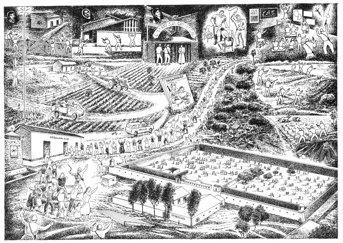 Este impactante cuadro de caracter descriptivo fue hecho por el camarada Alberto Barrett y retrata uno de los episodios represivos más brutales de nuestra historia reciente conocido como la “Pascua Dolorosa”, ocurrido en abril de 1976.