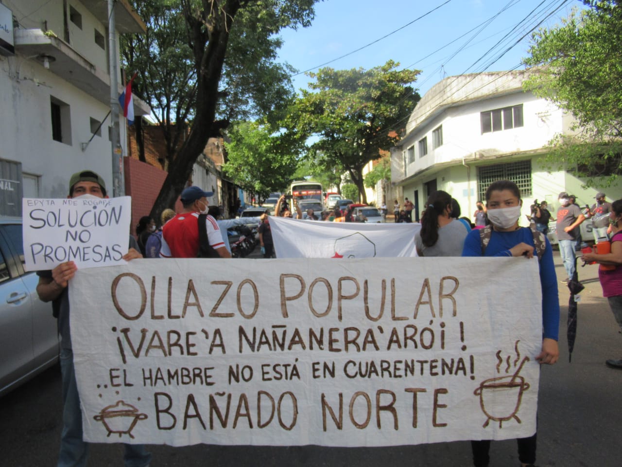 La articulación de organizaciones bañadenses, Norte, Sur y Tacumbú, que representa a unas 40 ollas populares, más otros pobladores de asentamientos de ciudades de Itauguá, Limpio, Ñemby, Ypané, Luque, San Antonio y Villa Elisa, se manifestaron este martes, frente a la Secretaría de Emergencia Nacional (SEN) para exigir nuevamente a la institución el cumplimiento del compromiso asumido por el Ministro Joaquin Roa, consistente en la entrega de insumos suficientes y de calidad para sostener la iniciativa popular y solidaria.