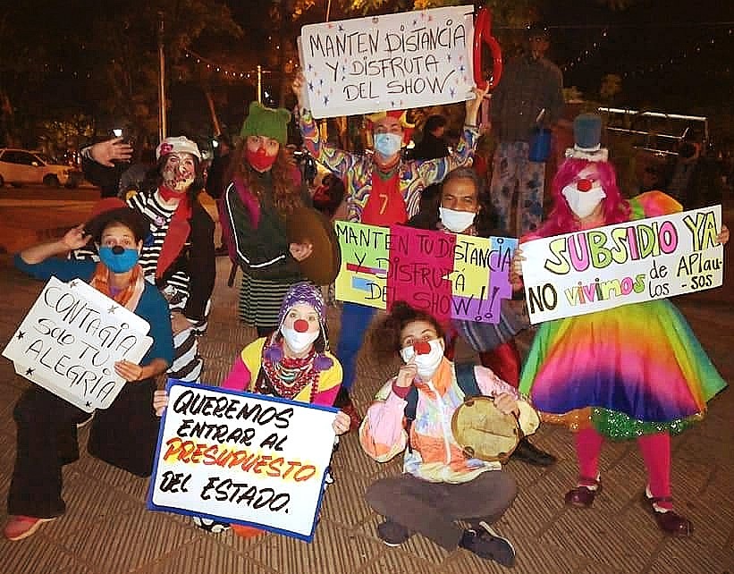 Trabajadores del arte y el espectáculo: circenses, payasos, actrices y actores, bailarines, vestuaristas, gestores de eventos, marcharon por el centro de Asunción exigiendo a la Secretaría Nacional de Cultura que cumpla con las funciones que le competen. Este gremio ha sido de los más golpeados por la pandemia y abandonados por el Estado. Piden medidas y protocolos que les permitan volver a trabajar y subsidio para poder sobrevivir.