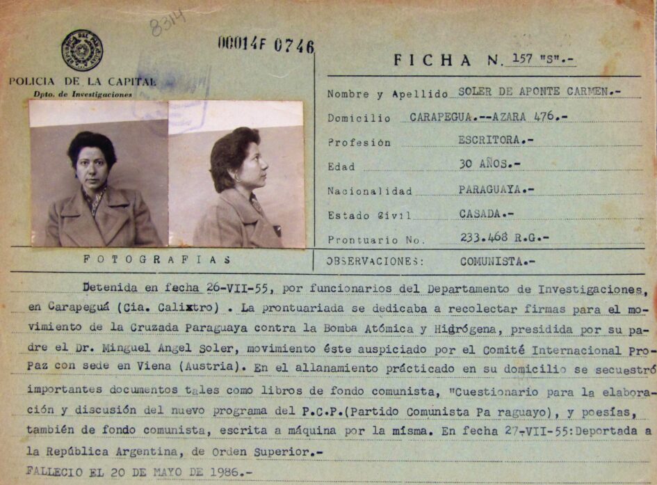Carmen Soler fue una poeta paraguaya nacida en 1924 y fallecida en el exilio, en 1985. Su obra posee una particularidad especial dentro del corpus de la literatura paraguaya moderna: es la expresión lírica de su propia acción revolucionaria en tiempos de terrorismo de Estado.