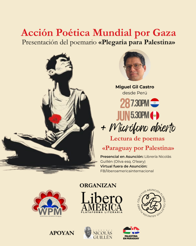 El encuentro comienza con la lectura del Manifiesto por la Paz del Comité Coordinador del Movimiento Poético Mundial, seguido de la presentación del poemario “Plegaria para Palestina”, editado por Liberoamérica, del poeta quechua peruano Miguel Gil Castro, quien estará presente desde Lima de manera telemática. La obra, disponible de manera libre, gratuita y digital, cuenta con ilustraciones de los artistas paraguayos Daryel Rodríguez y Gabriela Armoa. Culminada la presentación, tendrá lugar la Lectura de Poemas por Gaza en los versos de autores de Paraguay y Palestina, con un cierre musical.