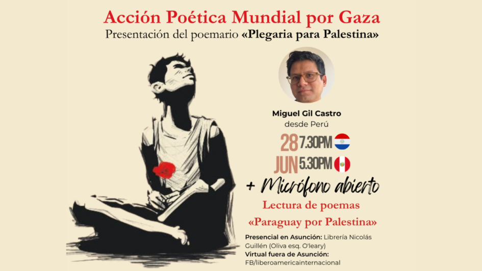 El encuentro comienza con la lectura del Manifiesto por la Paz del Comité Coordinador del Movimiento Poético Mundial, seguido de la presentación del poemario “Plegaria para Palestina”, editado por Liberoamérica, del poeta quechua peruano Miguel Gil Castro, quien estará presente desde Lima de manera telemática. La obra, disponible de manera libre, gratuita y digital, cuenta con ilustraciones de los artistas paraguayos Daryel Rodríguez y Gabriela Armoa. Culminada la presentación, tendrá lugar la Lectura de Poemas por Gaza en los versos de autores de Paraguay y Palestina, con un cierre musical.