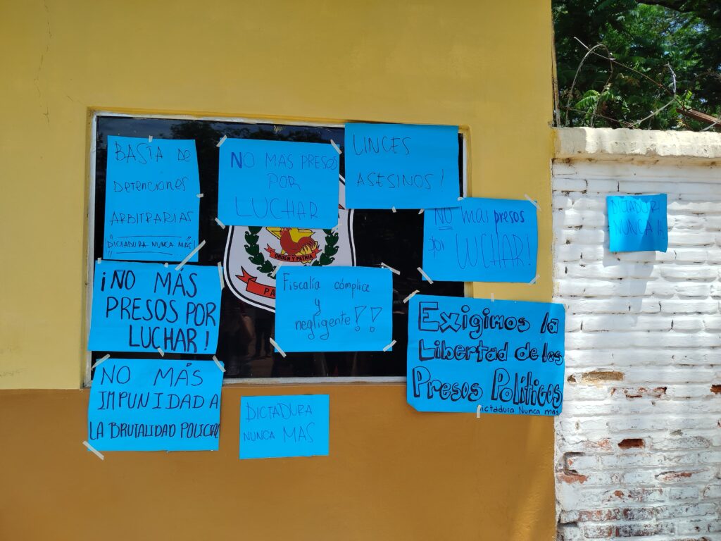 Carteles elaborados por jóvenes estudiantes y trabajadores frente a la Agrupación Especializada
