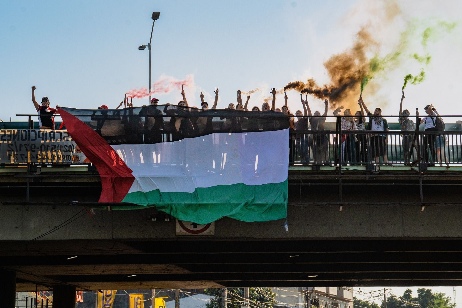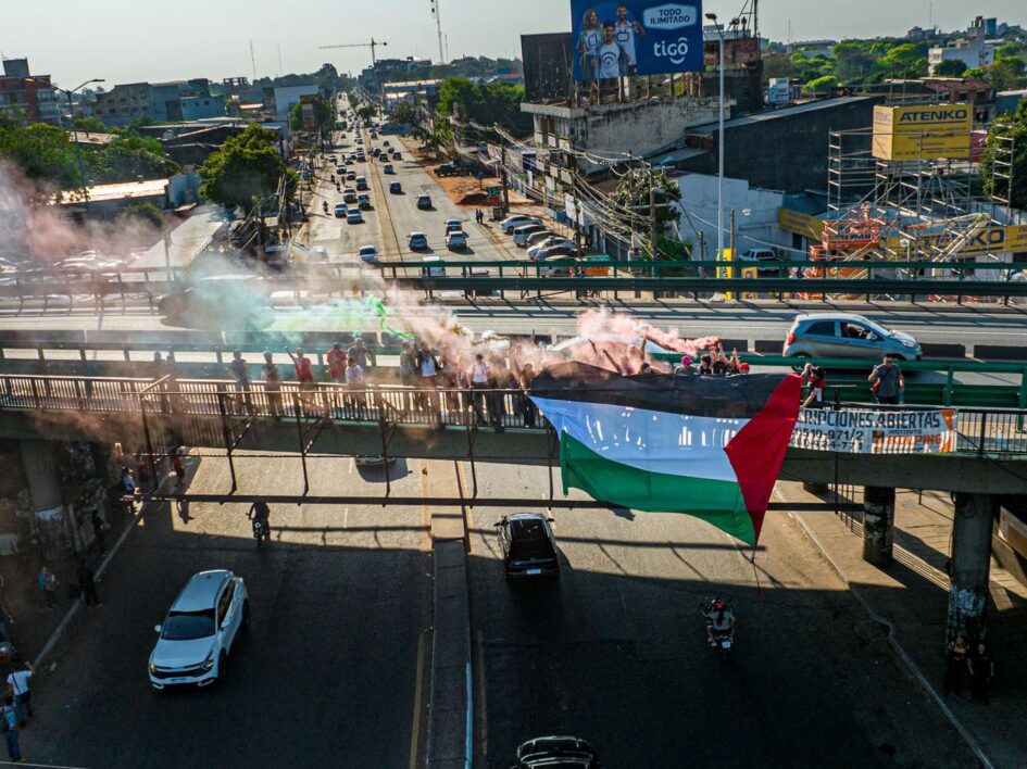 Miembros de la articulación se congregaron en el viaducto de la Avda. Madame Lynch y «Calle Última» y desplegaron la bandera palestina, a la vez que encendieron sus colores con bengalas. También exigieron la liberación inmediata de los casi 500 activistas (periodistas, médicos, abogados, etc.) que iban con destino a la Franja de Gaza en la Flotilla Global Sumud para auxiliar a su población con artículos de ayuda humanitaria, y que fueron secuestrados y torturados por fuerzas israelíes.