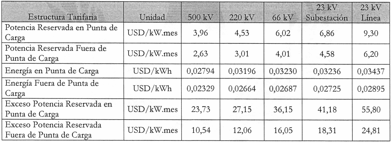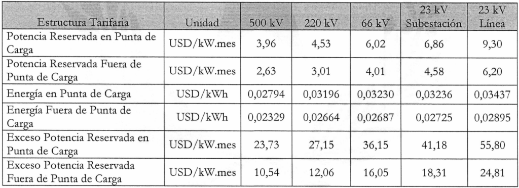 Es hora de analizar las tarifas establecidas con una vigencia de 15 años por el art. 5º. Se establecen diferentes precios según la tensión de la línea de alimentación que realiza la entrega (500 kV, 220 kV, 66 kV y 23 kV).